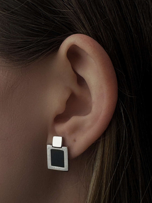 Silver steel earrings with black square