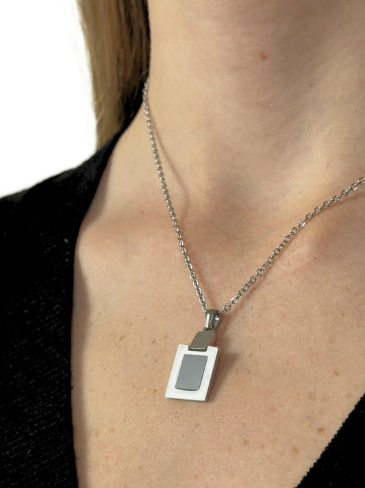 Silver steel necklace with black square