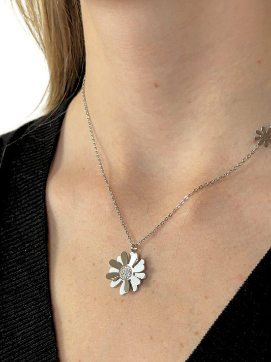 Silver steel necklace with flower