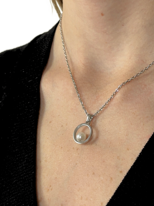 Circle silver steel necklace with pearl