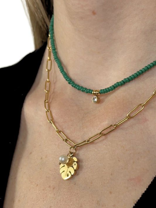 • Golden steel leaf and beads necklace