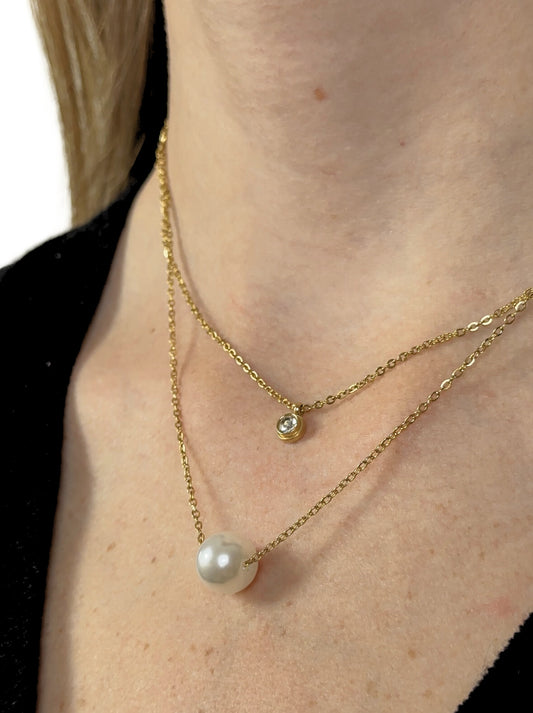 • Golden steel necklace with pearl and crystal