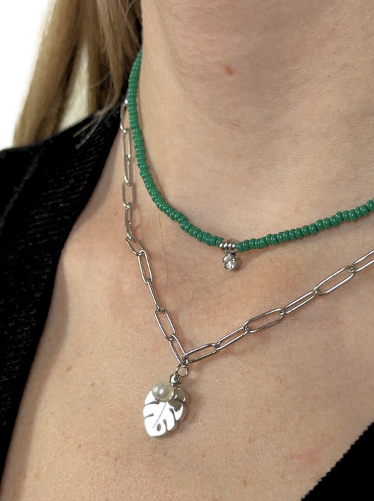 Silver steel leaf and beads necklace