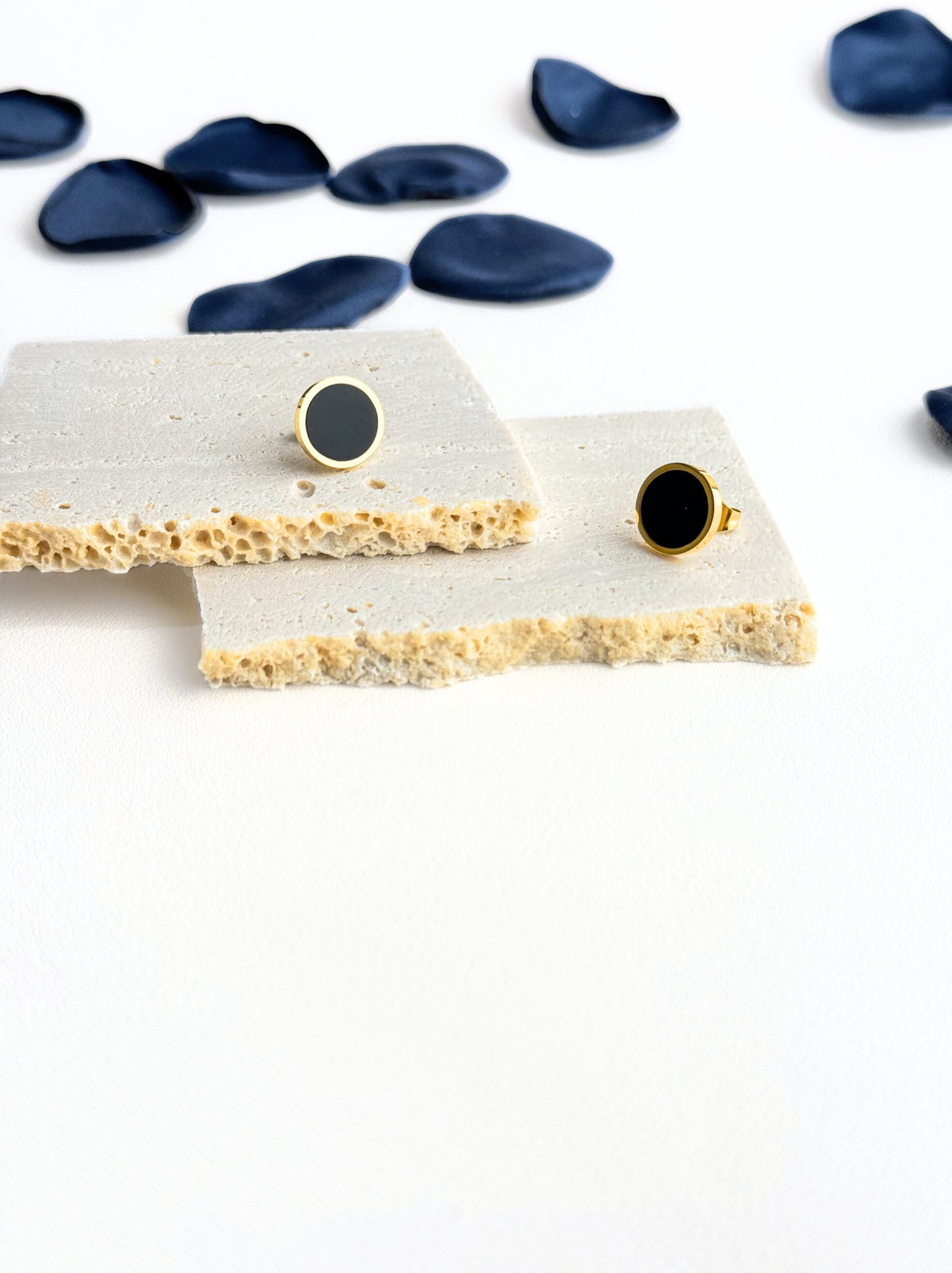 Brincos de aço dourados com medalha preta